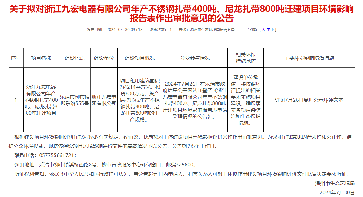 7月30日,溫州市生態(tài)環(huán)境局樂清分局就浙江九宏電器有限公司年產(chǎn)不銹鋼扎帶400噸、尼龍扎帶800噸遷建項目環(huán)境影響報告表作出審批意見并對外進行公告,公告時間:5個工作日。