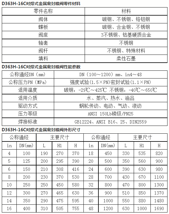 D363H-16C對焊式金屬密封蝶閥采用精密的J形彈性密封圈和三偏心多層次金屬硬密封結(jié)構(gòu),被廣泛用于介質(zhì)溫度≤425℃的治金 、電力、石油化工、以及給排水和市政建設(shè)等工業(yè)管道上,作調(diào)節(jié)流量和載斷流體使用。該閥采用三偏心結(jié)構(gòu),閥座與碟板密封面均采用不同硬度和不銹鋼制作,具有良好的耐腐蝕性,使用壽命長,本閥具有雙向密封功能,產(chǎn)品符合國家GB/T13927-92閥門壓力試驗標(biāo)準(zhǔn)。